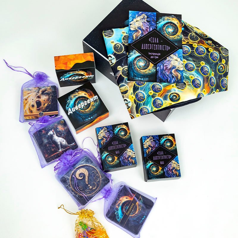 «Дивергент» — це не просто трансформаційна гра, а результат синергії 41 експерта з психології, коучингу, ігропрактики та арт-терапії. В її основі — сучасні підходи до самопізнання, глибинна робота з архетипами, символами та особистісною трансформацією. Гра стала логічним продовженням популярної колоди МАК «Дивергент» і однойменної книги, об’єднуючи кращі практики індивідуальної та групової роботи. Це інструмент, який відкриває нові горизонти для професіоналів допомагаючих професій, дозволяє вийти за межі шаблонних рішень та створити унікальний клієнтський досвід.