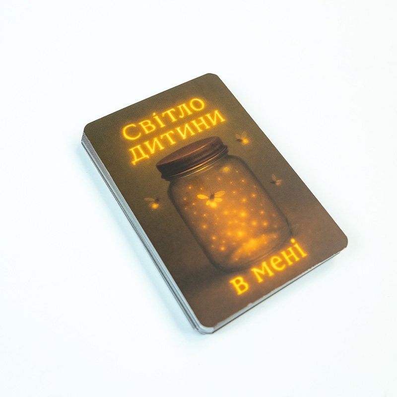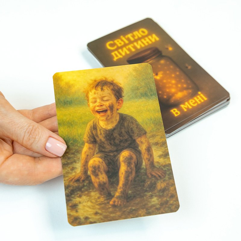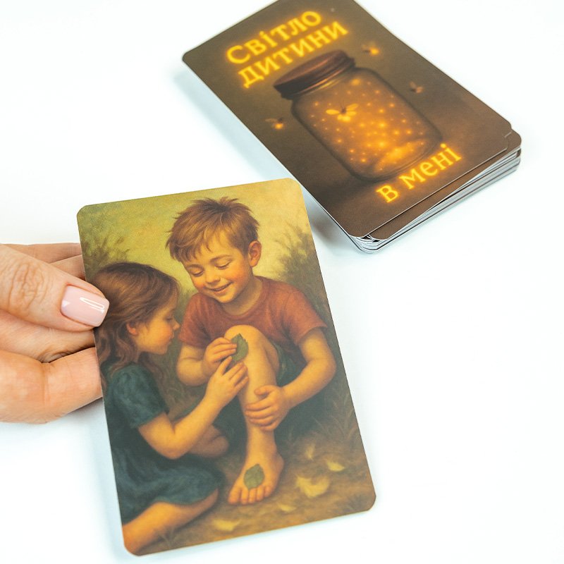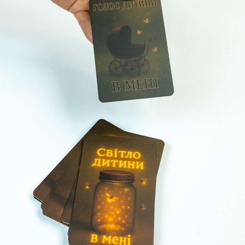 Авторська колода «Голос дитини в мені / Світло дитини в мені» створена як інструмент діалогу між цими двома полюсами. Її унікальність — у парній структурі: тіньова частина допомагає почути приглушені почуття й незакриті потреби, ресурсна — активує гру, радість, творчість і підтримку. Разом вони утворюють безпечний міст між болем і силою, відкриваючи простір для глибокої, але м’якої трансформації.