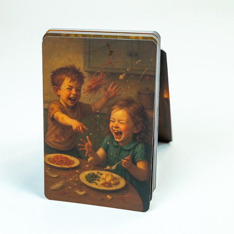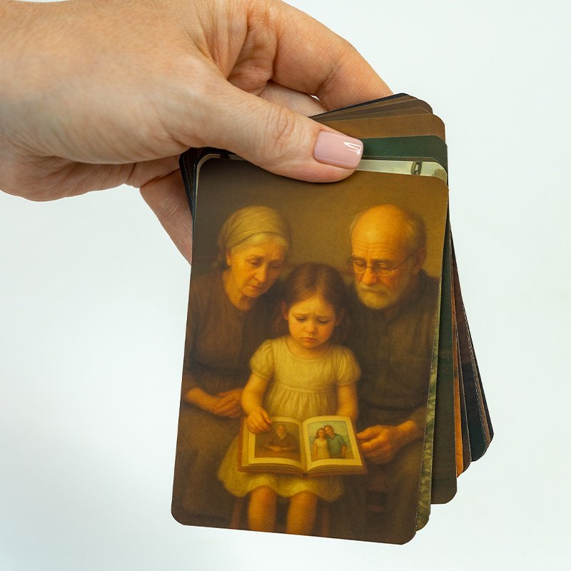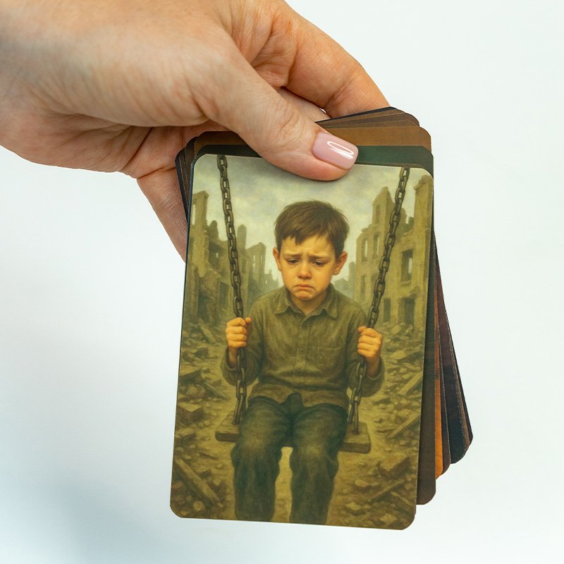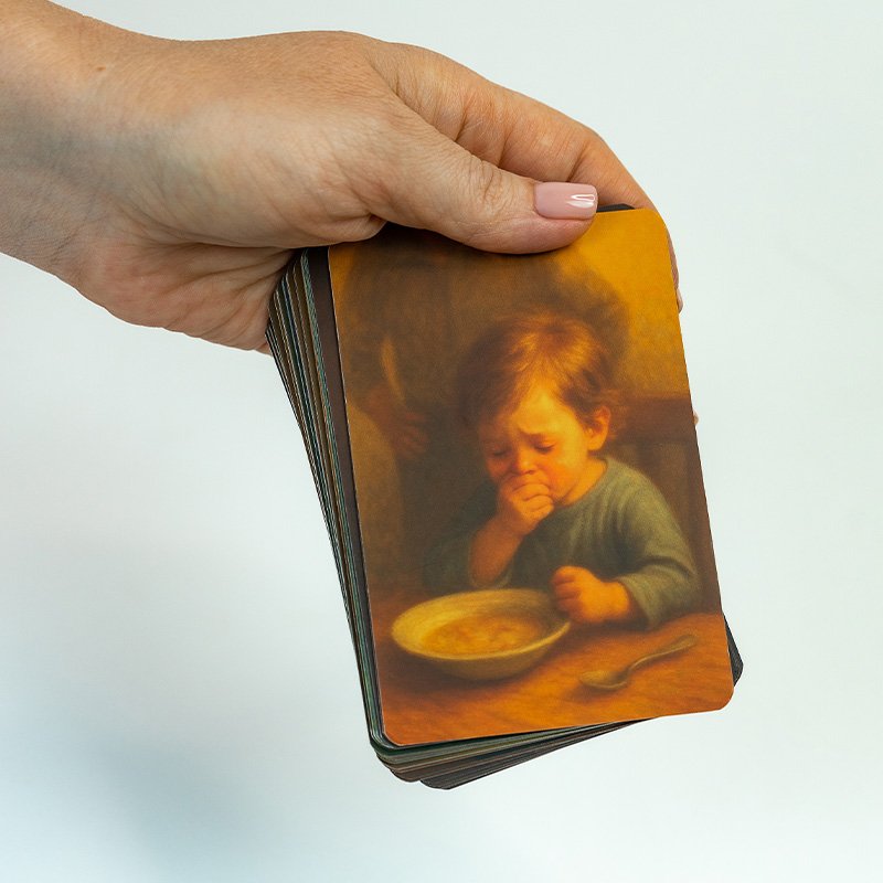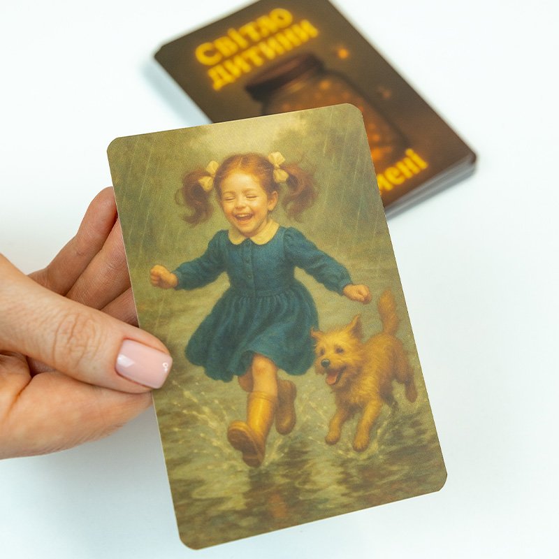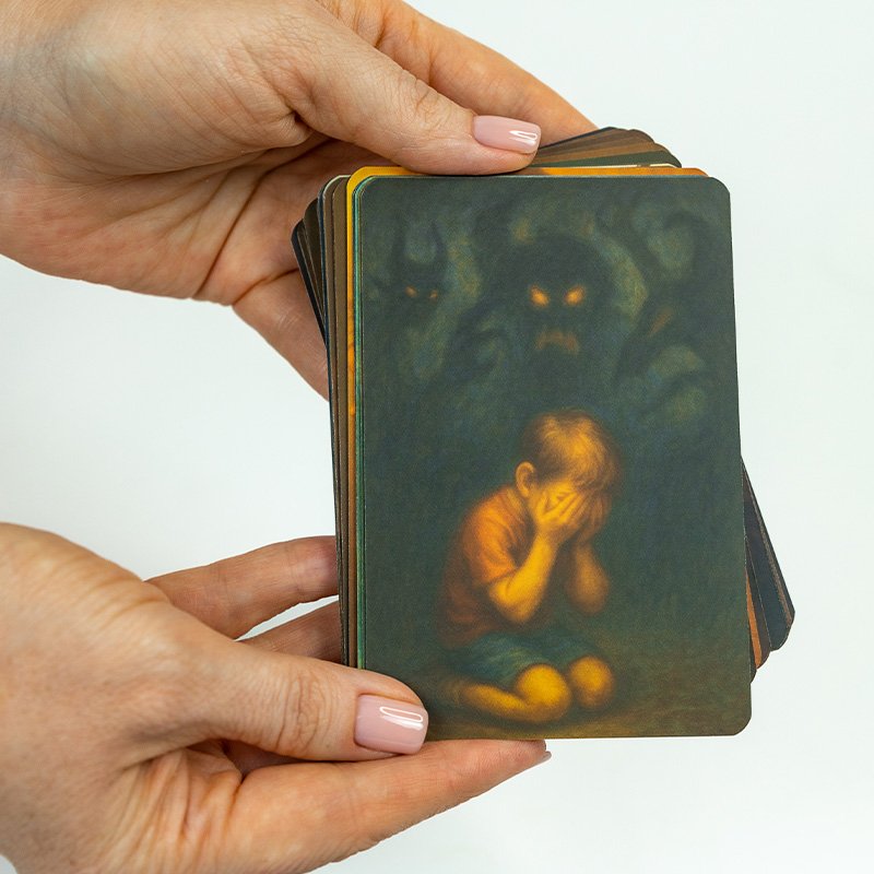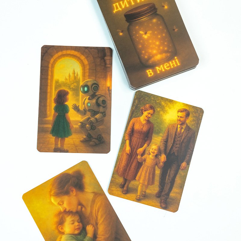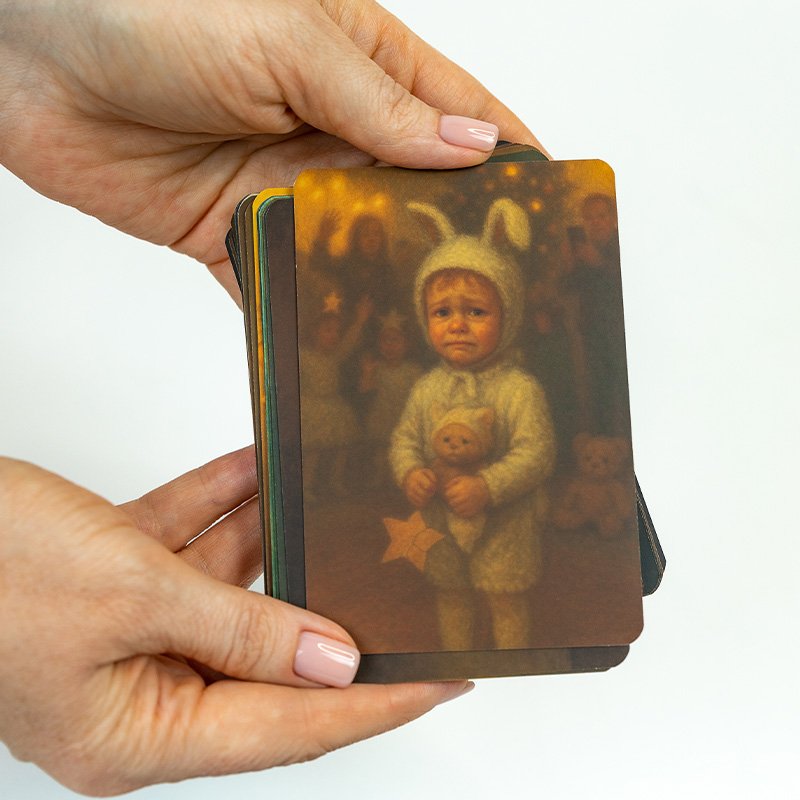 Колода створена, щоб її хотілося тримати в руках і до неї хотілося повертатися: м’яка матова ламінація, продумані сюжети, теплі відтінки, що не втомлюють очі. Це той випадок, коли естетика підсилює процес і робить роботу глибокою, але лагідною.