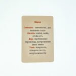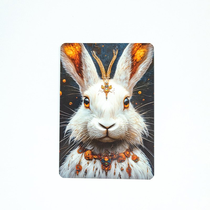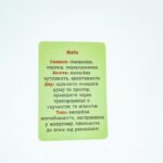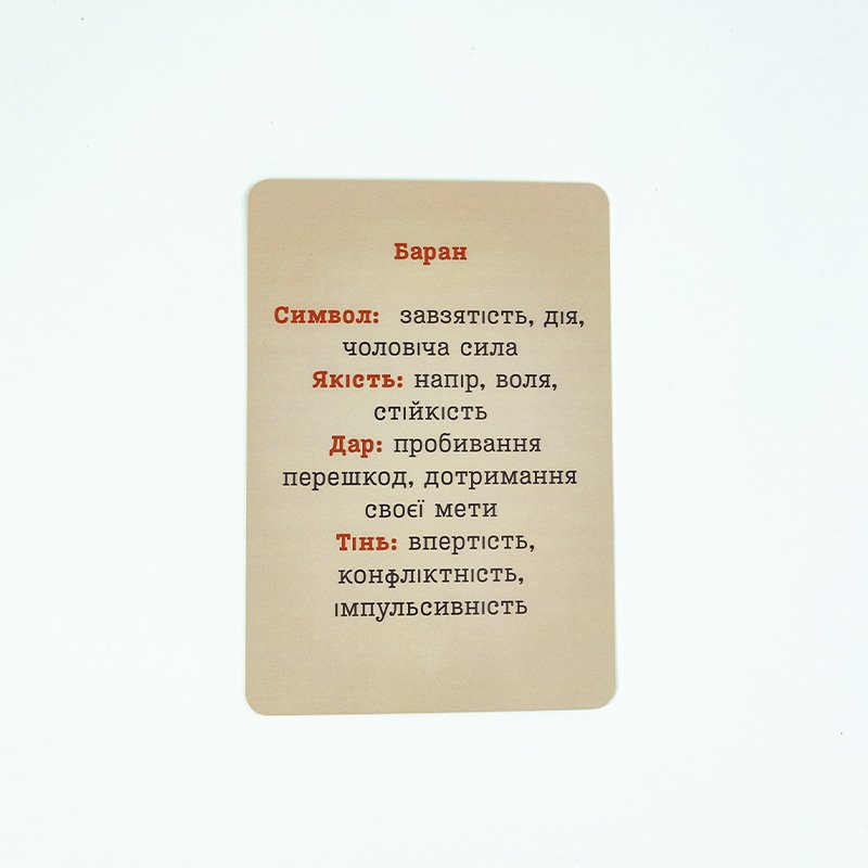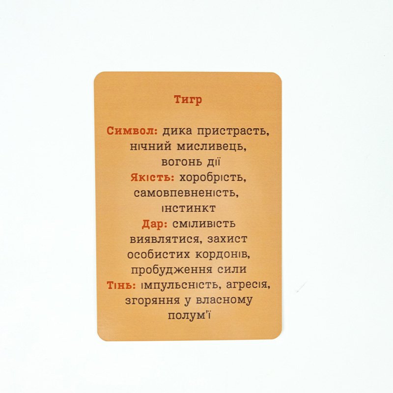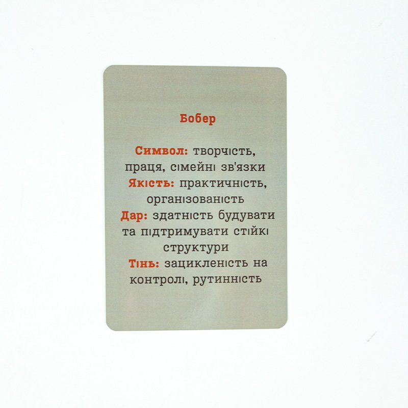 - У комплекті — 40 карт розміром 145х100 мм, виконаних із ламінованого картону преміальної якості. Кожна карта — це унікальний образ тварини, що несе власний архетип і сенс. На звороті — підказки для роздумів, які допоможуть глибше зануритися у власний досвід.