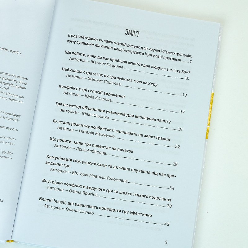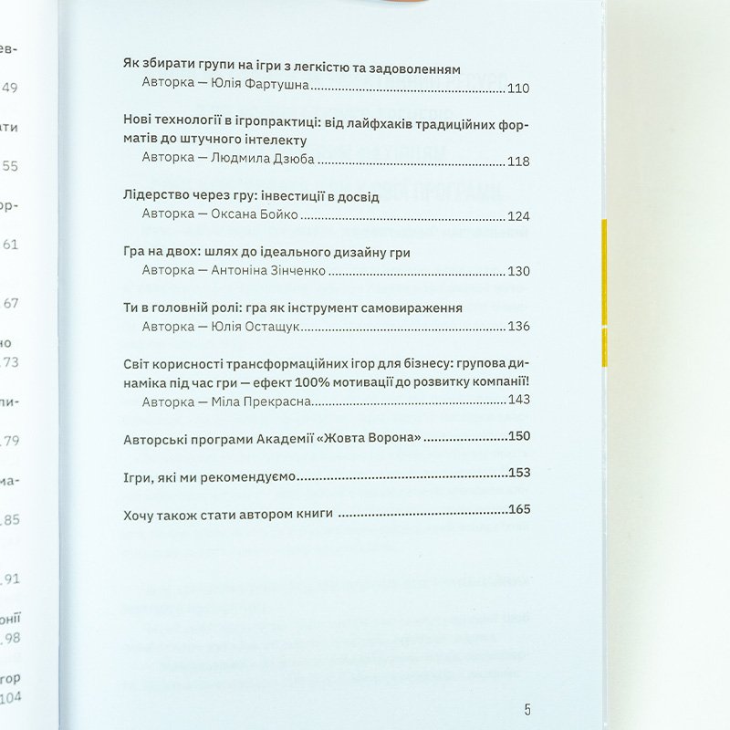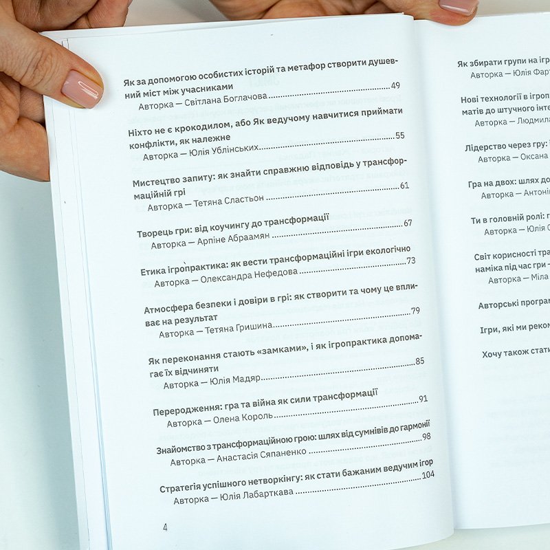 - Розділи‑кейси від практиків: робота з конфліктами і поверненням «на старт», активне слухання, ілюзії ведучого, мистецтво запиту, вплив етапів розвитку особистості на запит гравця, лідерство через гру, спільний дизайн гри, нетворкінг, нові технології (включно з AI), ігри для бізнесу та корпоративні формати.