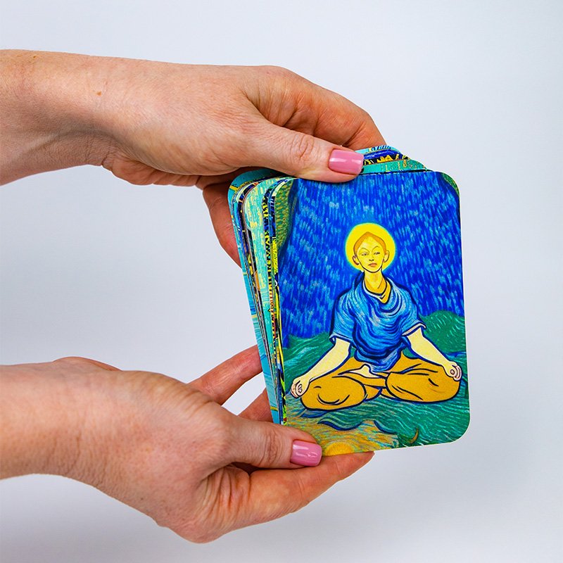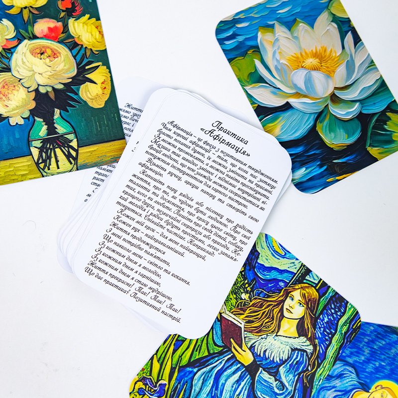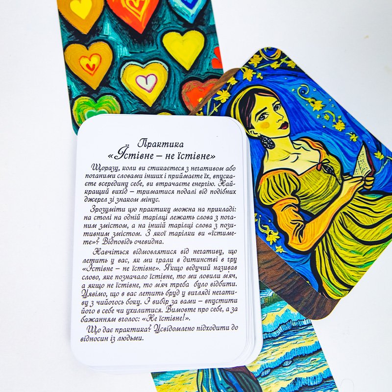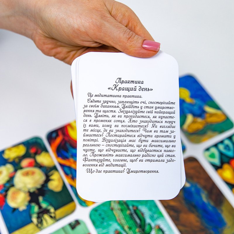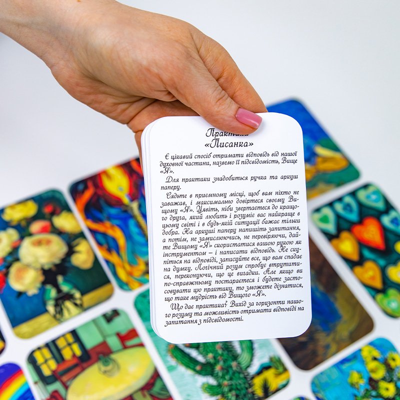 - 36 двосторонніх карт (90х130 мм): на одній стороні — унікальний візуальний символ, на іншій — глибоке смислова техніка, що відкриває нові грані для роздумів і рефлексії.