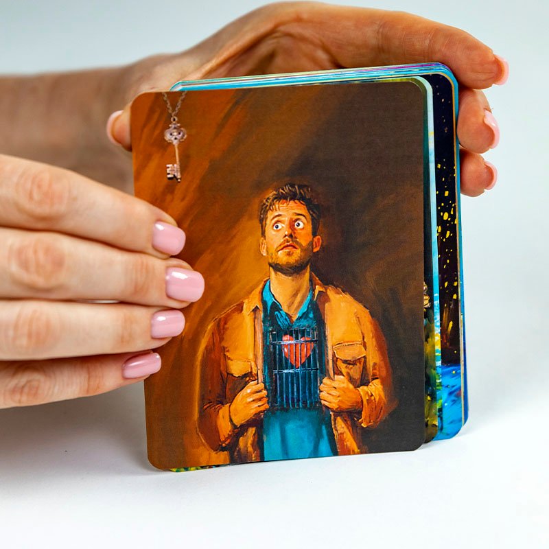 - 88 атмосферних сюжетних зображень (9×12 см), що охоплюють ключові життєві теми — від радості до втрати, від пошуку сенсу до натхнення. Кожна карта — це окремий світ, який відкриває глибину емоцій і стимулює внутрішній діалог.